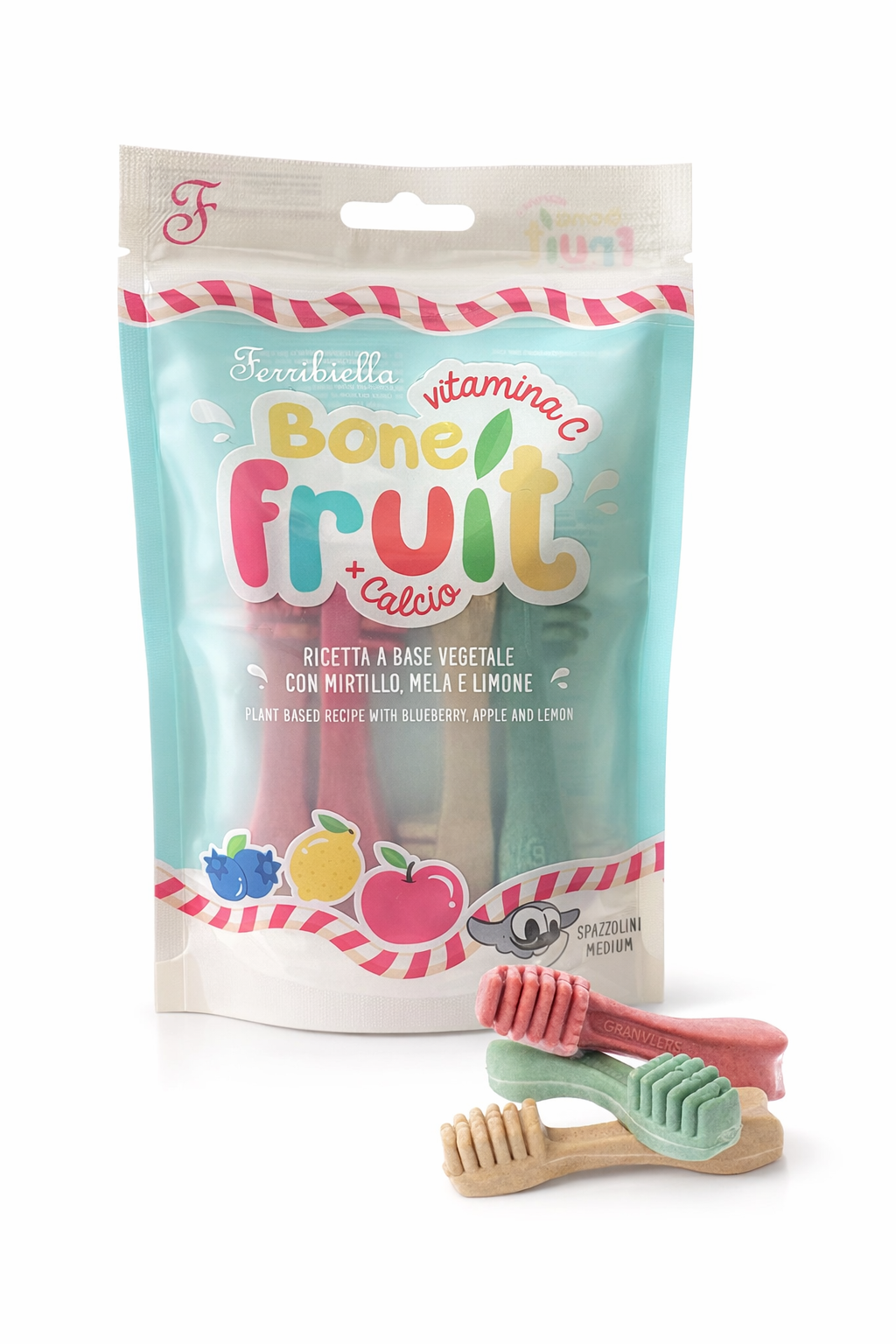 Bone Fruit Spazzolini può essere offerto quotidianamente come complemento al pasto o come momento di svago e cura. Può rappresentare un valido supporto all’integrazione dell’igiene orale, favorendo la rimozione meccanica della placca dentale attraverso la masticazione.