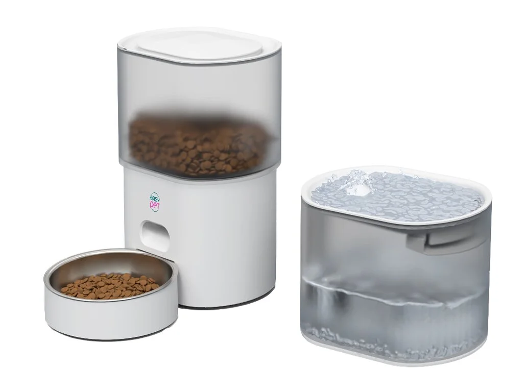 Il kit EasyPet include un distributore automatico di cibo e una fontanella per l’acqua, progettati per facilitare la gestione dell’alimentazione e dell’idratazione degli animali domestici.