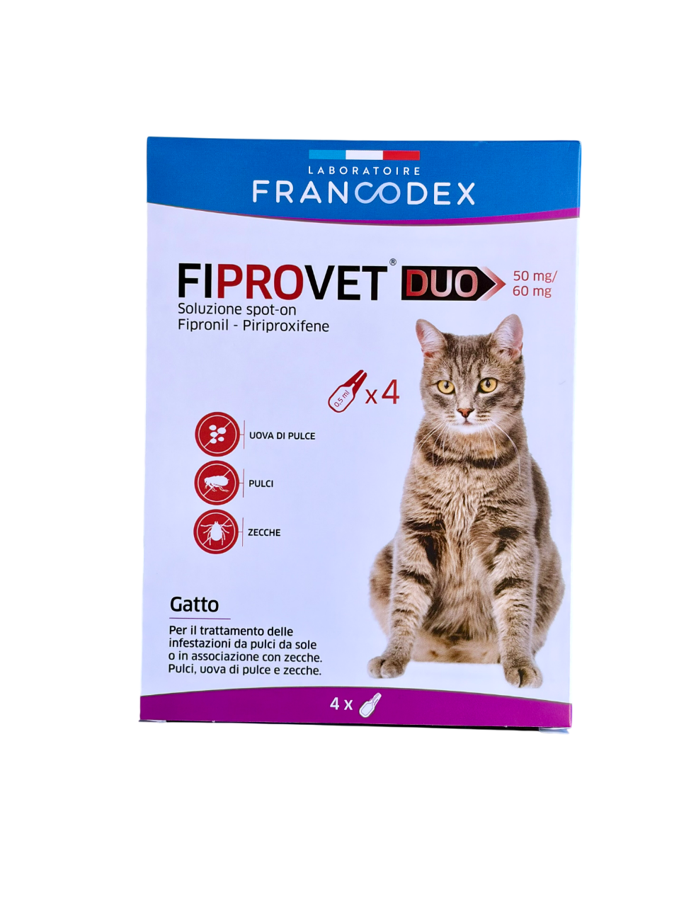 Offri al tuo gatto la migliore difesa contro pulci e zecche con Fiprovet Duo Gatto. Questa soluzione antiparassitaria topica, prodotta da FRANCODEX, combina due principi attivi potenti per una protezione duratura e completa.