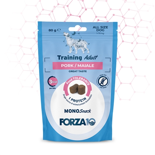 FORZA10 Training Adult Maiale è indicato per proprietari di cani adulti che desiderano un premio nutrizionalmente bilanciato, con un basso apporto calorico e una singola fonte proteica di qualità. È particolarmente adatto a soggetti con sensibilità alimentari grazie alla formula Grain Free e all’assenza di cereali aggiunti.