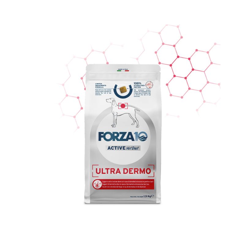 FORZA10 Ultra Dermo Active รจ la scelta ideale per chi cerca un alimento dietetico di alta qualitร per la salute della pelle del proprio cane, disponibile in pratiche confezioni da 1,5kg e 10kg.