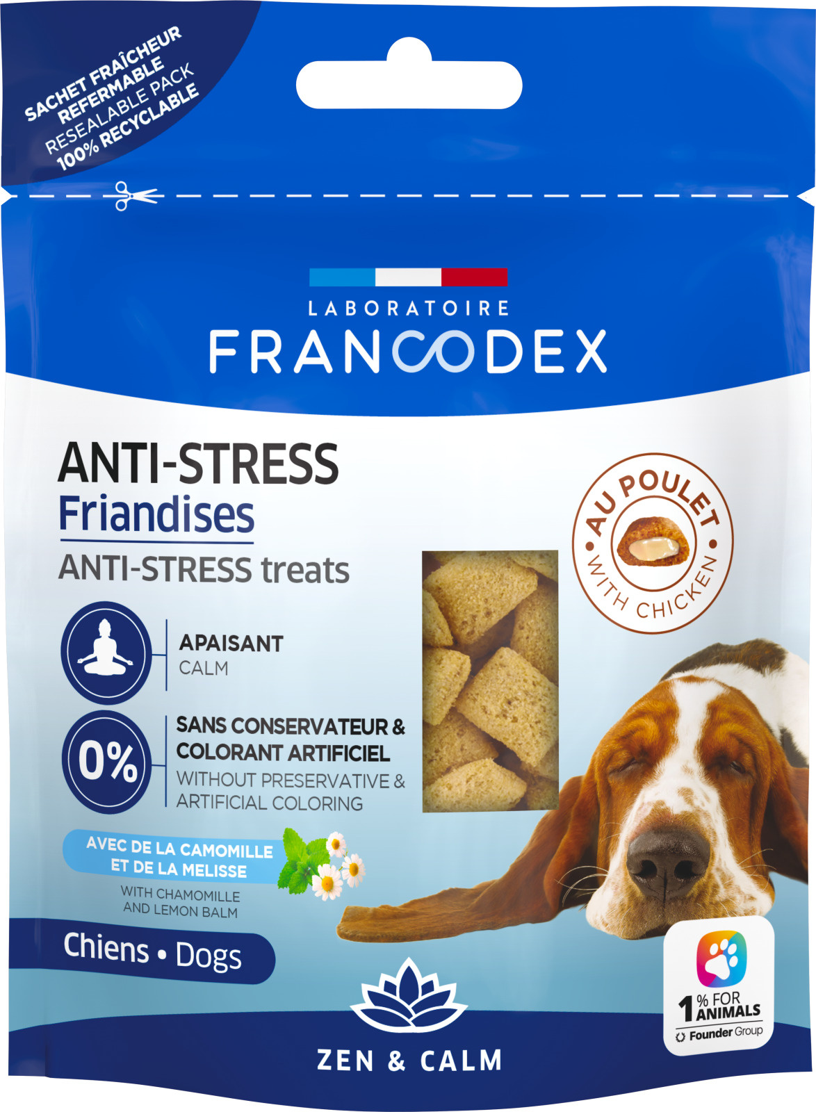Parole chiave: Snack anti-stress cane, FRANCODEX, calmante per cani, ansia cane, stress cane, prodotti per cani, benessere animale, 75gr.