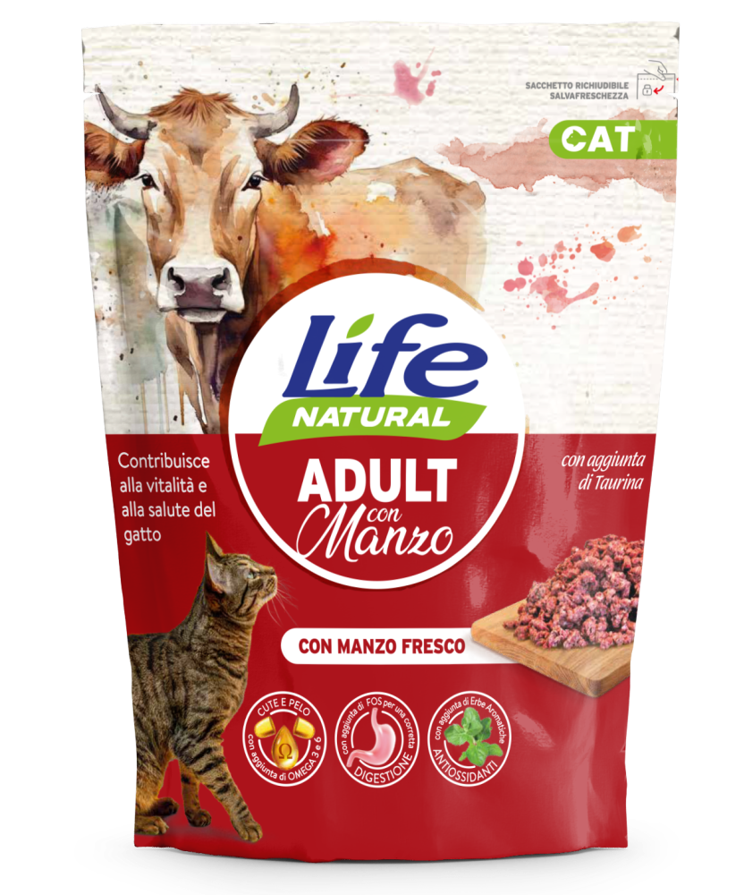 Keyword: cibo secco gatto, alimento gatto adulto, life cat, manzo, nutrizione gatto, cibo per gatti.