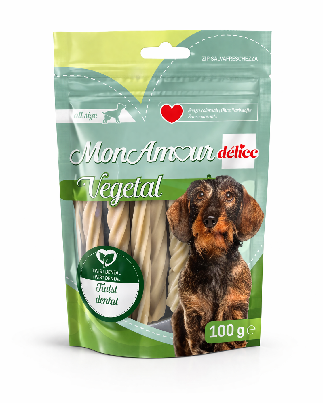 MonAmour Delice Vegetal Twist Dental 100g è un prodotto specificamente formulato per la cura dentale degli animali domestici. Si tratta di un alimento o snack dalla consistenza e composizione pensate per favorire l’igiene orale, aiutando a ridurre la formazione di placca e tartaro durante la masticazione.