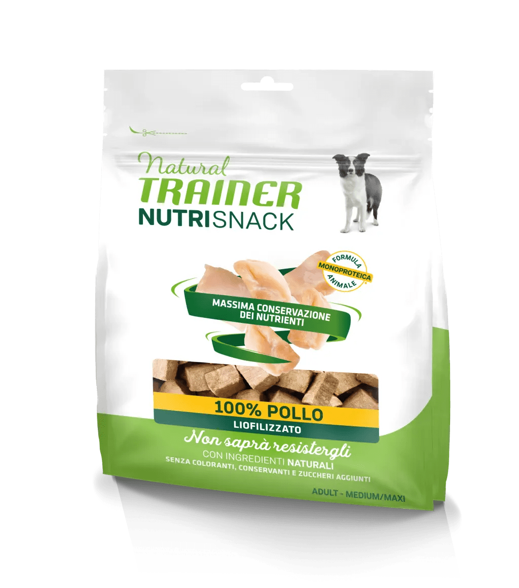 Natural Trainer Nutri Snack Pollo è adatto a cani di tutte le taglie e età che apprezzano un alimento gustoso e semplice da consumare. La sua composizione, deducibile dal nome, indica una base proteica di pollo, ingrediente generalmente gradito e digeribile per la maggior parte degli animali domestici.