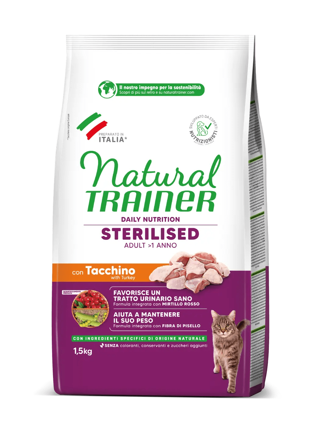 - Controllo del Peso: Grazie a un moderato contenuto di grassi e all’integrazione di fibre vegetali, come la fibra di pisello, Natural Trainer Sterilised aiuta a mantenere il peso forma ideale, prevenendo l’aumento di peso post-sterilizzazione.