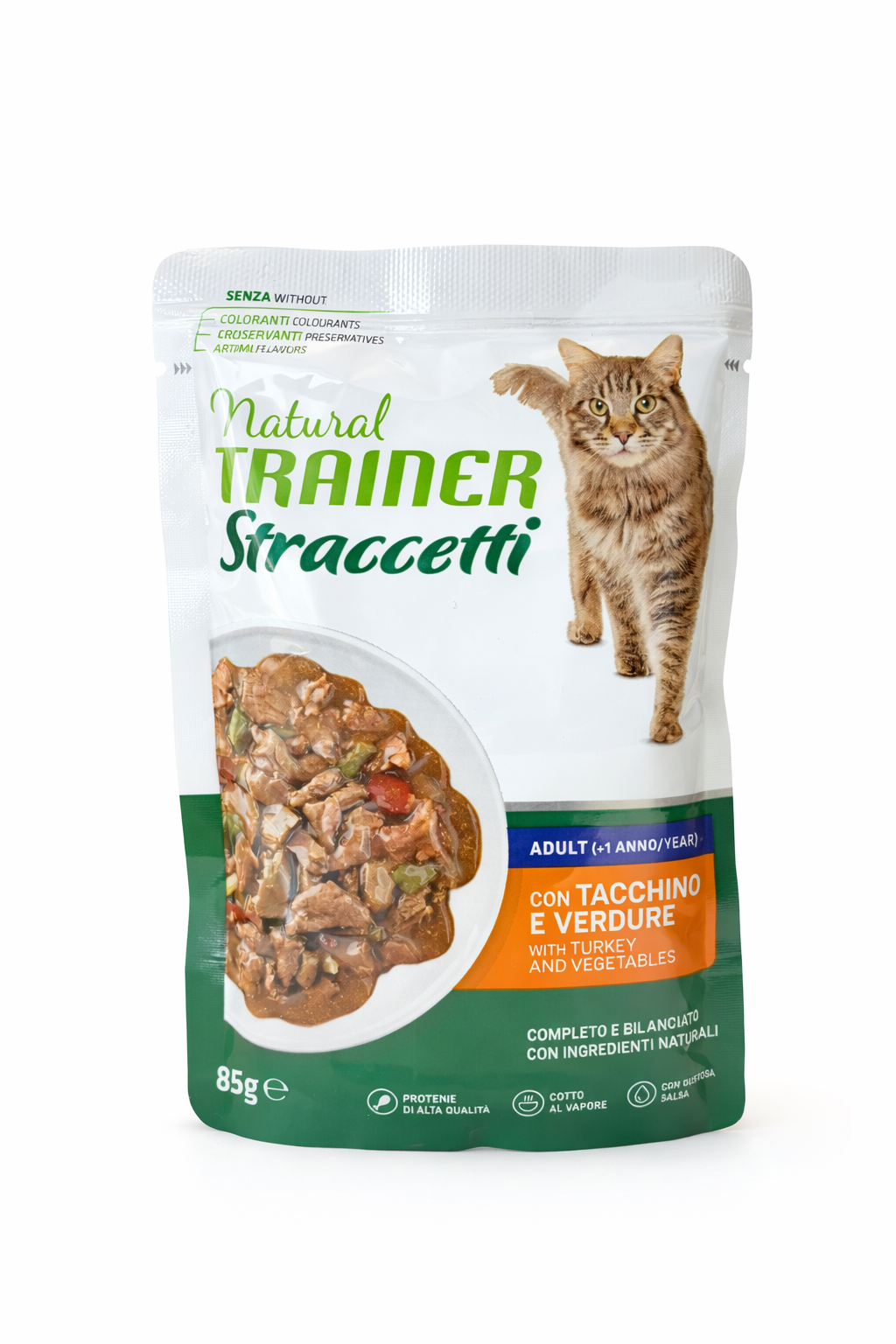 Natural Trainer Straccetti Adult Tacchino e Verdure è consigliato quando si desidera offrire al gatto un pasto umido completo, che integri o sostituisca la dieta secca abituale. È adatto a chi cerca un alimento con ingredienti selezionati e una consistenza appetitosa.