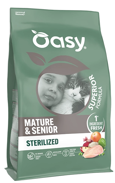 Oasy Superior Formula Sterilized Mature & Senior Pollo è un alimento completo studiato specificamente per gatti sterilizzati di età superiore ai 7 anni. La formulazione è pensata per rispondere alle esigenze nutrizionali di animali adulti e anziani, con particolare attenzione al mantenimento della salute e del benessere nei gatti senior.