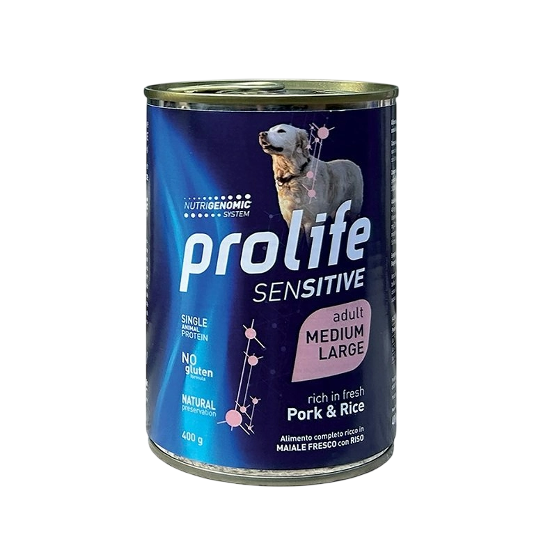 Prolife Dog Sensitive Maiale e Riso 400g รจ un alimento completo specificamente formulato per cani adulti di taglia media e grande con sensibilitร alimentare. Questo prodotto รจ studiato per offrire un pasto bilanciato e facilmente digeribile, pensato per soddisfare le esigenze nutrizionali di cani con particolari necessitร legate alla sensibilitร gastrointestinale.