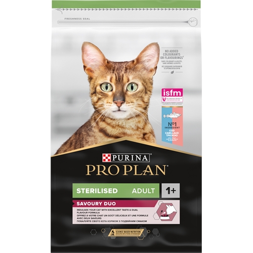 Scegli Purina Pro Plan Sterilised Savoury Duo per un gatto felice, sano e pieno di vitalità! Disponibile in diverse grammature per soddisfare ogni esigenza.
