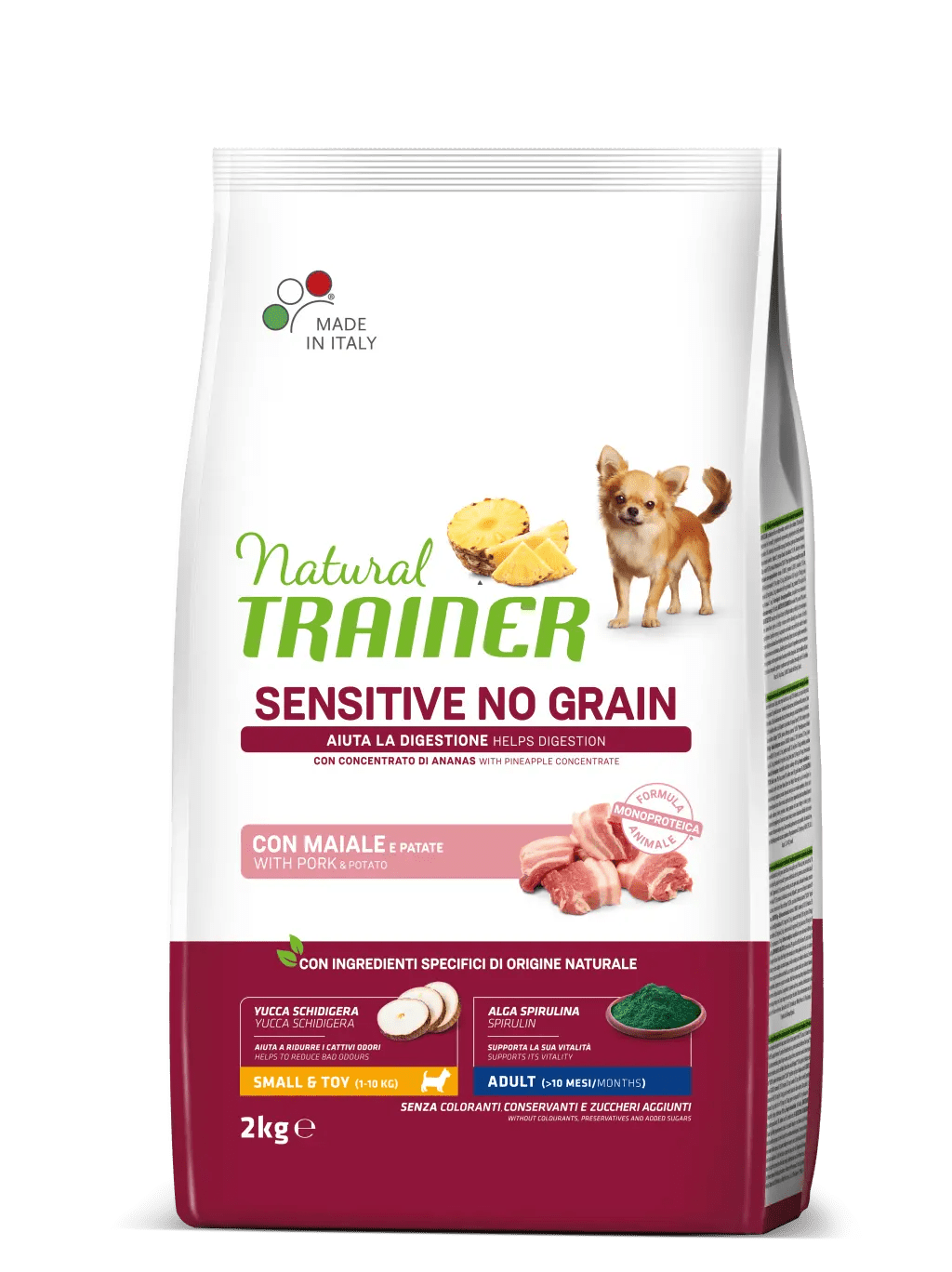 Per venire incontro alle diverse esigenze, Natural Trainer Sensitive No Grain Small&Toy Adult è disponibile nei formati da 800g e 2kg.