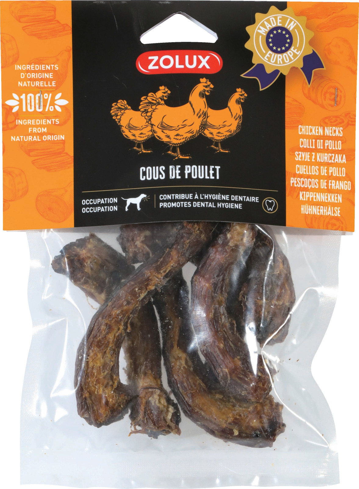 Parole chiave: snack per cani, biscotti per cani, collo di pollo, ZOLUX, snack naturale, cibo per cani, alimenti per cani, igiene orale cani.