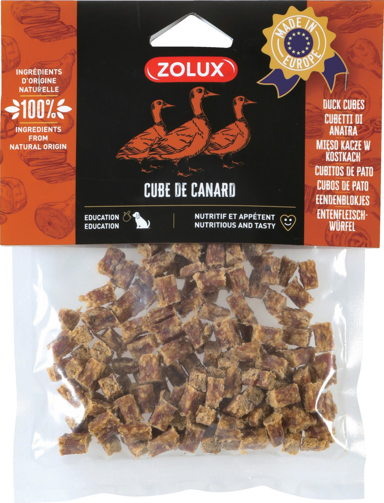 Parole chiave: snack per cani, cubi di anatra, ZOLUX, cibo per cani, addestramento cani, premi per cani, alimentazione cani, snack naturali per cani