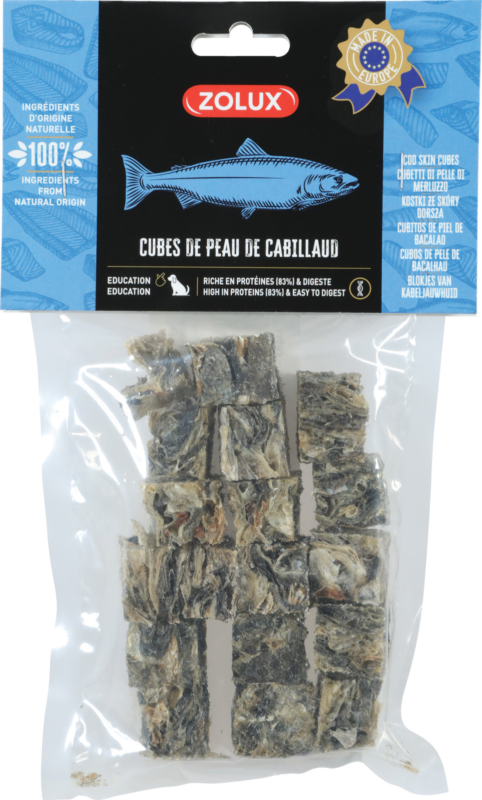 Parole chiave: snack per cani, cubetti di merluzzo, Zolux, cibo per cani, ricompensa per cani, omega-3, proteine, alimenti per animali domestici, merluzzo per cani, addestramento cani.